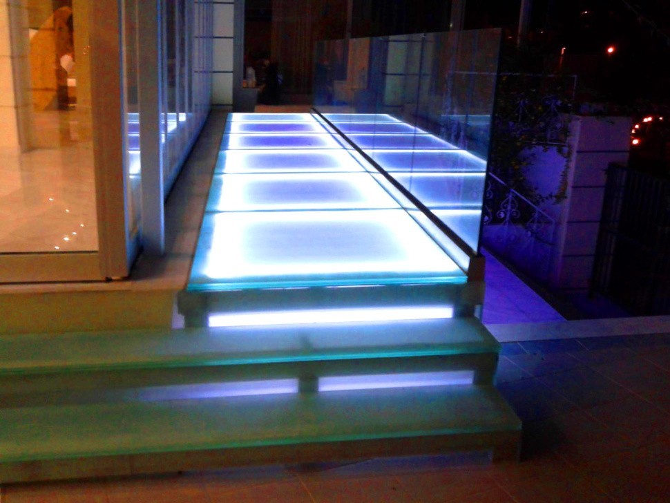 Стеклянные полы с подсветкой. На фотографиях стеклянного пола видно, что может быть либо встроена под прозрачные плиты. Этот способ используется если пол изготавливается как элемент декора и не выполняет функции перекрытия. Такой прием можно использовать для стеклянные потолков или полов например на кухне или в спорт зале или в гостиной (ваша гостья будет приятно удивлена вечером такой иллюминации пола). Если же стеклянная плита или стеклянные блоки я вляются межэтажным перекрытием, то для подсветки стекла используются светодиоды и они встраиваются в торцы стеклянных блоков. Для подсветки стеклянных ступеней или стеклянных межмаршевых площадок используется светодиодная лента.