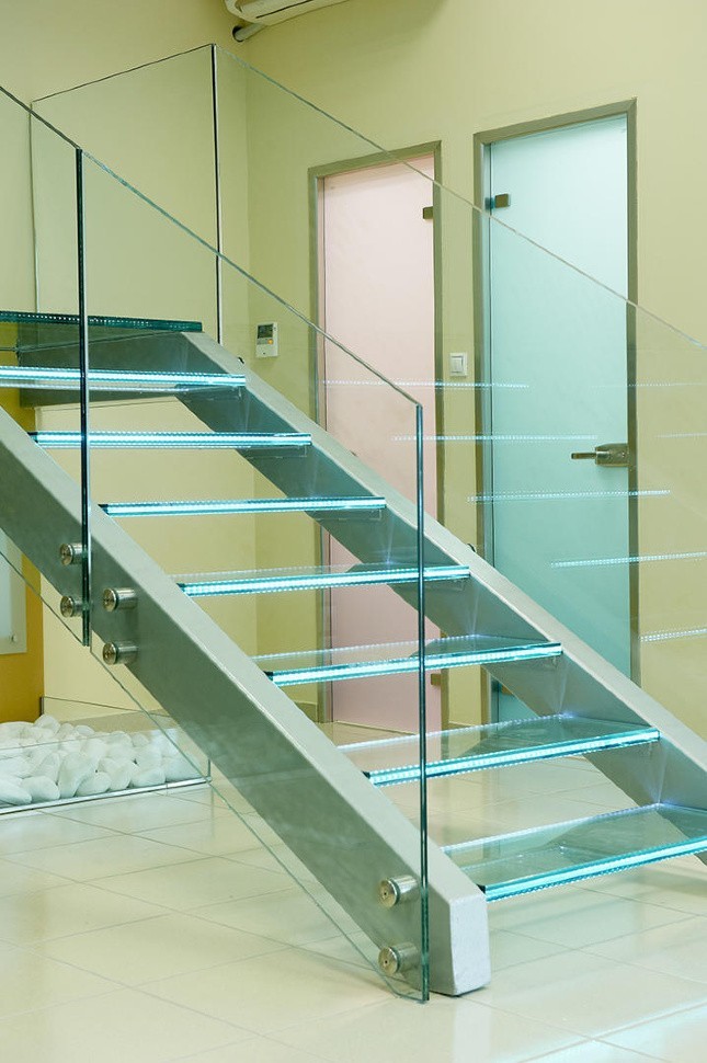 Стеклянные ступени на косоурной лестнице в доме в Нижнем Новгороде. Готовые проекты ПерилаГлавСнаб - фото 1