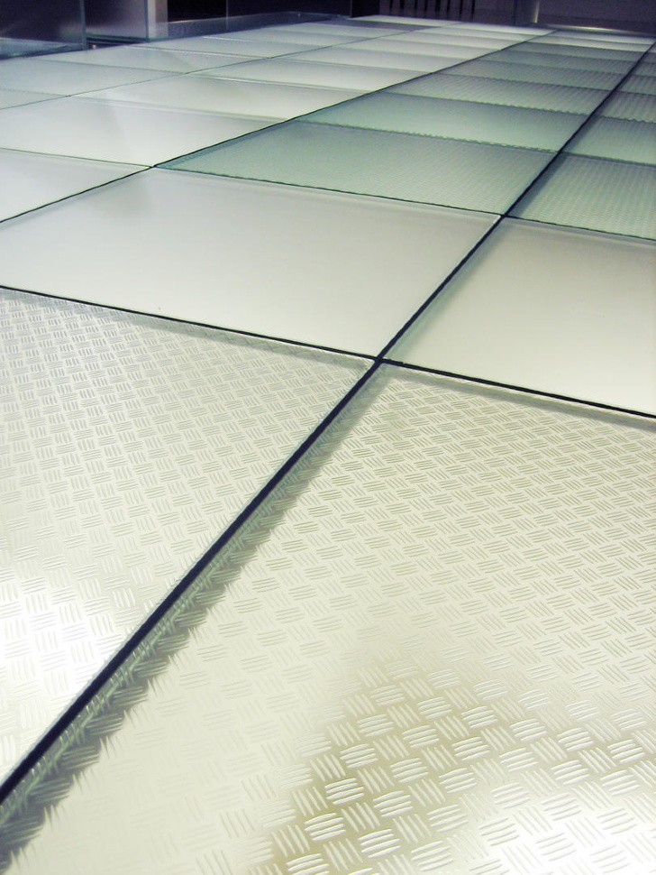 Для стеклянных полов используют различные виды матирования: хим. травление, пескоструйкой или закатка матовой пленкой. Нужно помнить, что лучше всего стекло использовать с двухсторонней матировкой и обязательно такое стекло покрывать подменным стеклом.