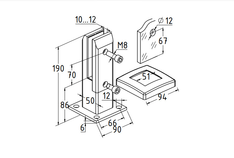 Стеклодержатель литой напольный, плоский 50х50х190 мм, для стекла 10-12 мм, полированный AISI 304, уценненый.